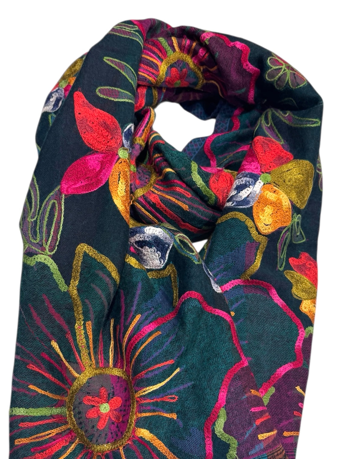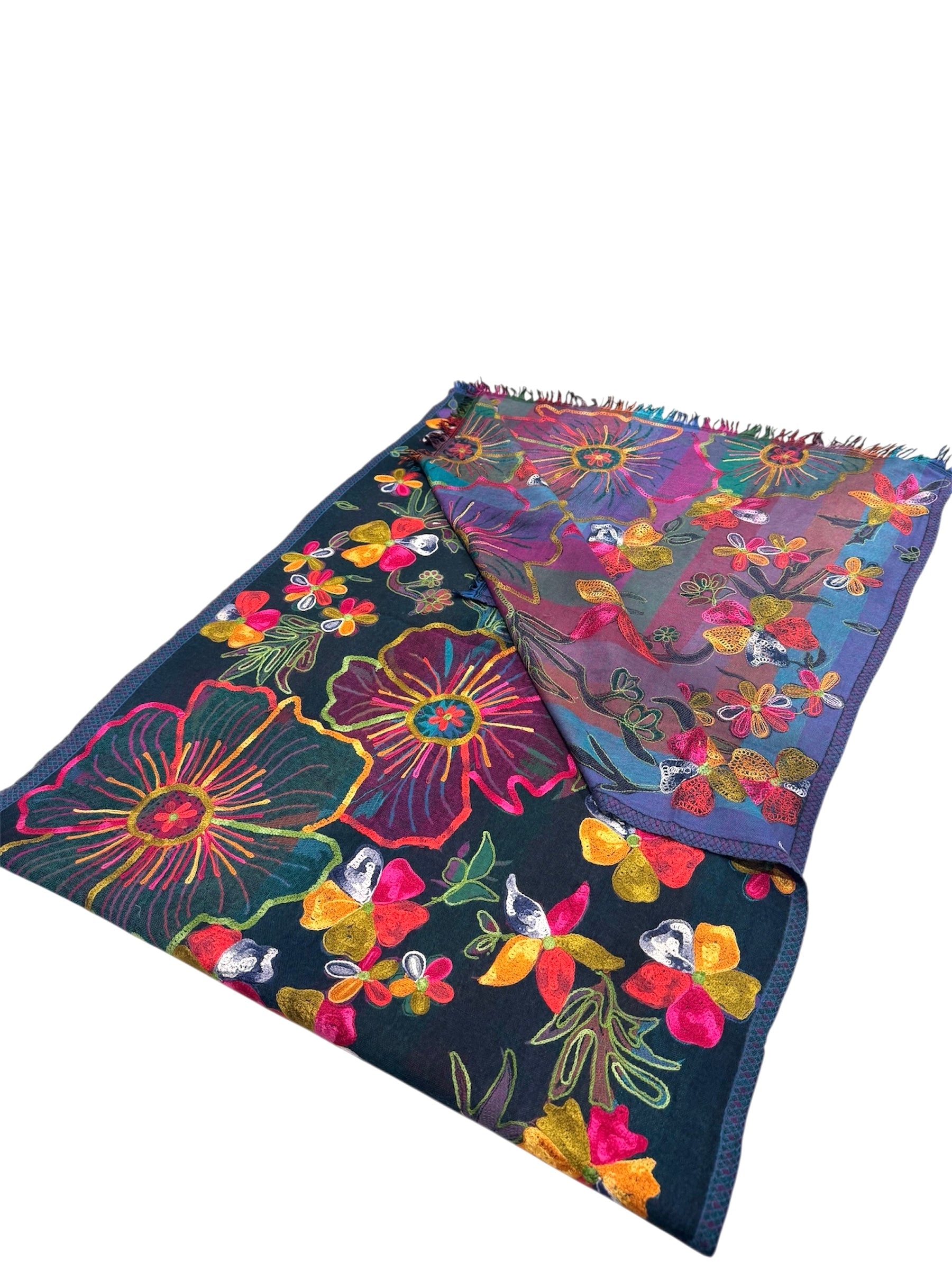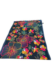 A gorgeous charcoal Floral Merino wool scarf /shawl with all-over embroidery floral designs from the Northern part of the Himalayas.